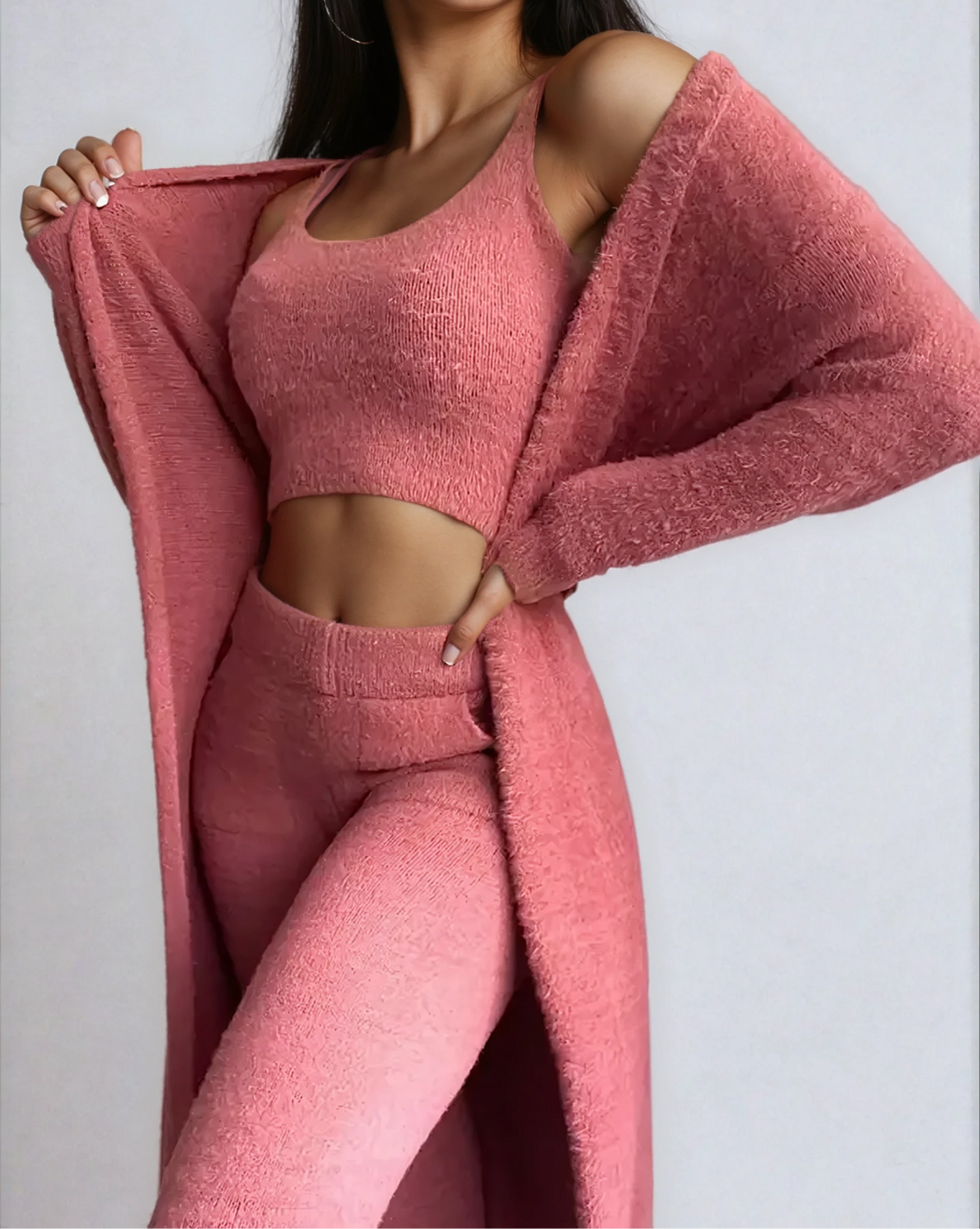 超ふわふわのフリース素材を使用し、ハイウエストパンツ・長袖トップス・カーディガンの完璧なレイヤードコーデが完成します。
