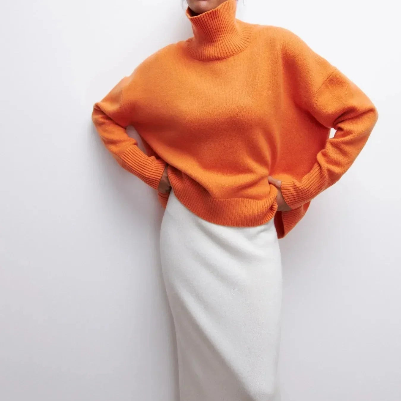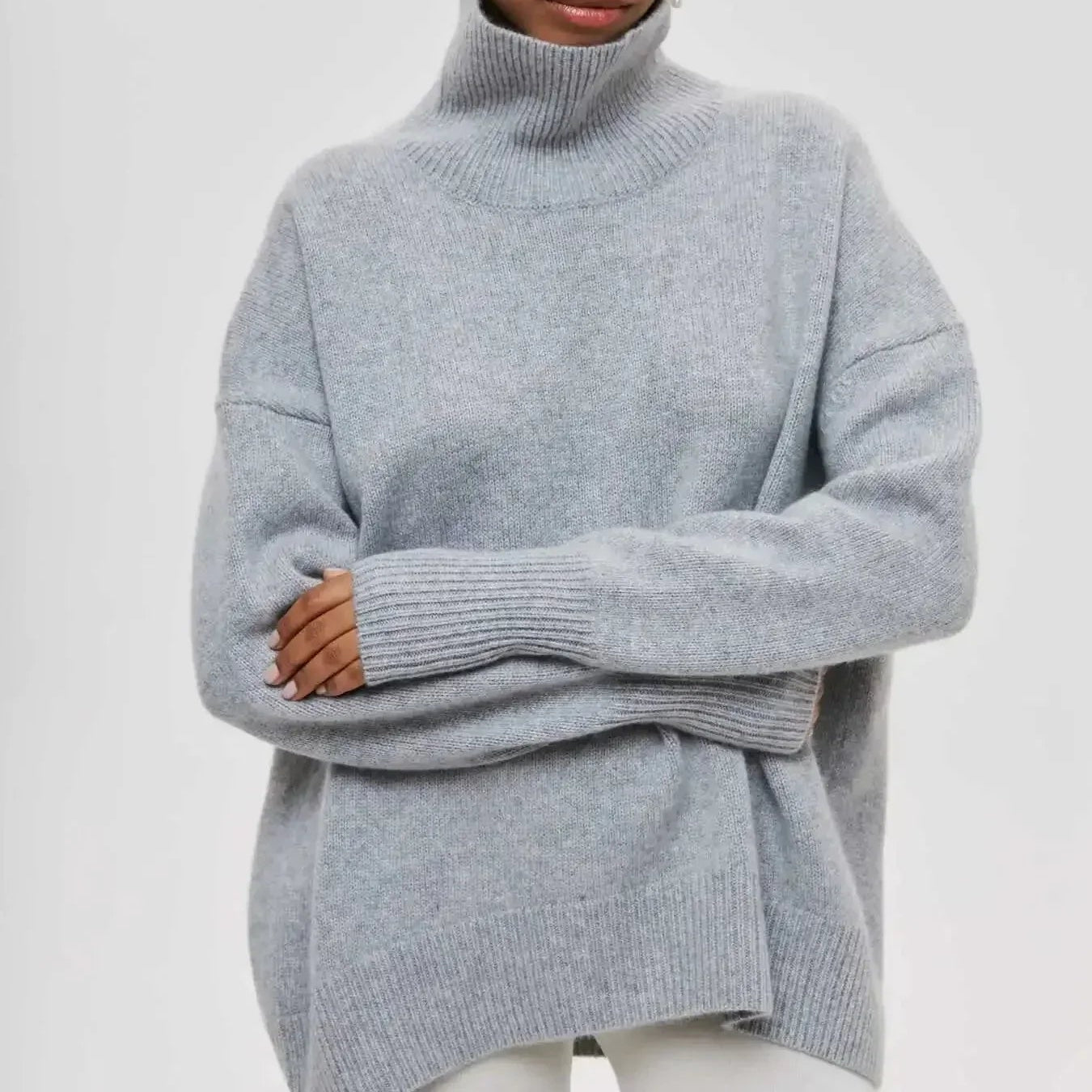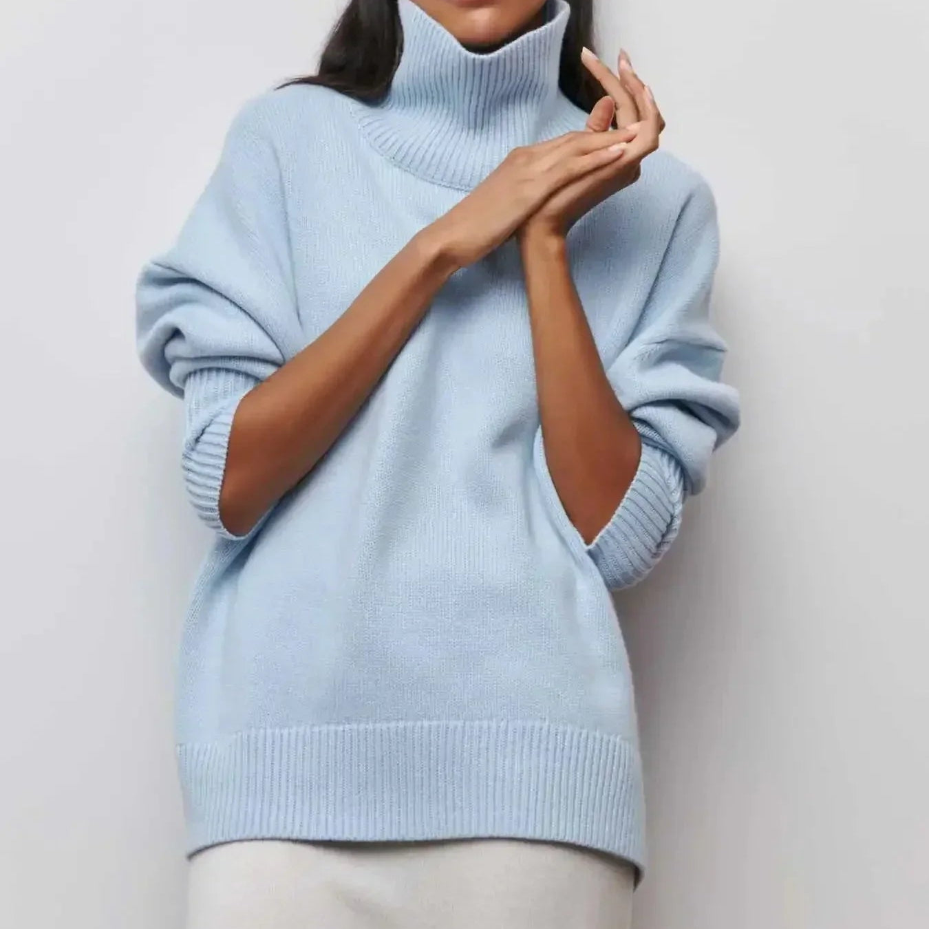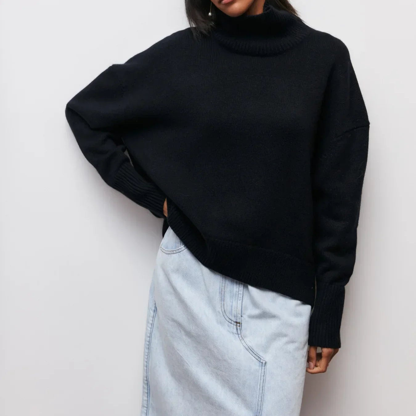 柔らかなリブニットとリラックスしたシルエットが、重ね着にも一枚でも美しく決まるタートルネックセーターです。