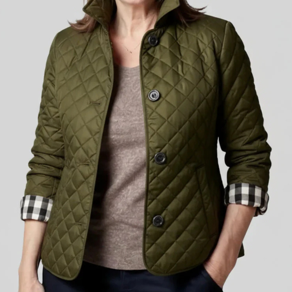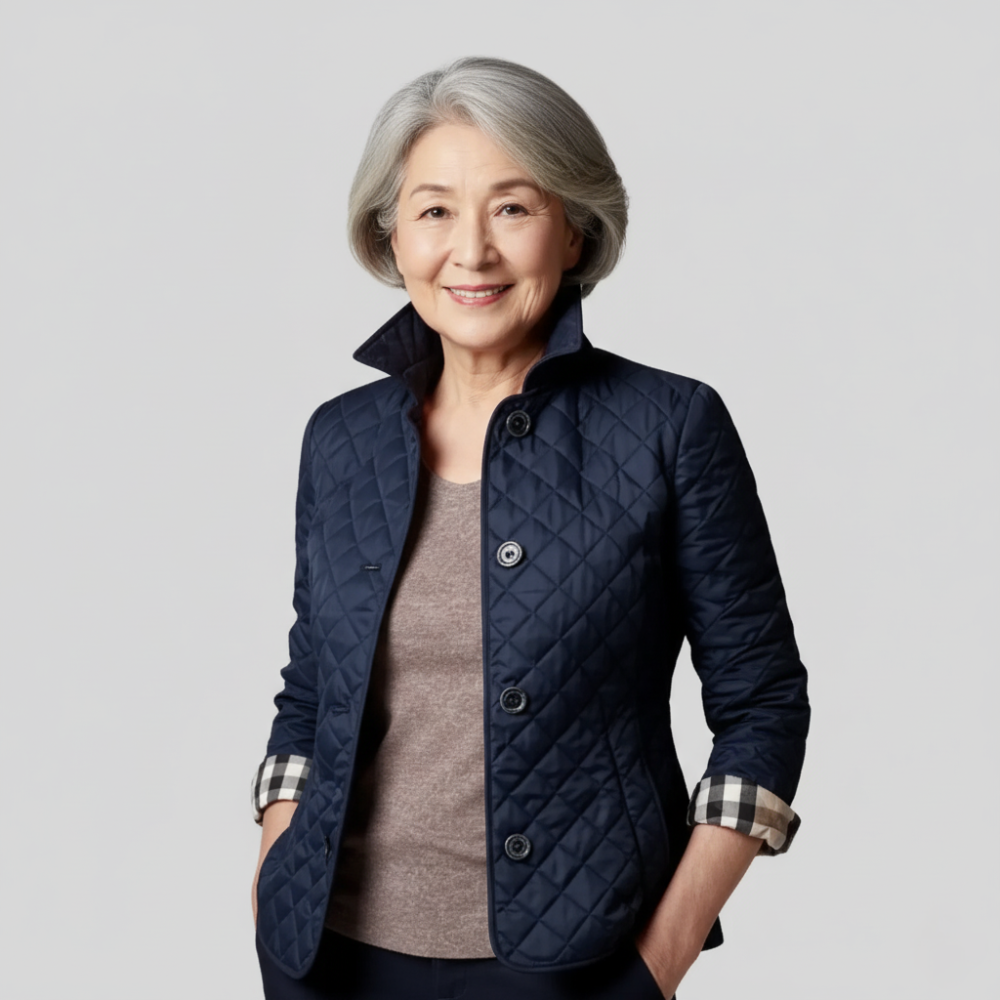 Okada キルティングジャケットは、秋の澄んだ朝や冬の冷たい日にも、上品さと快適さを両立できるようにデザインされています。